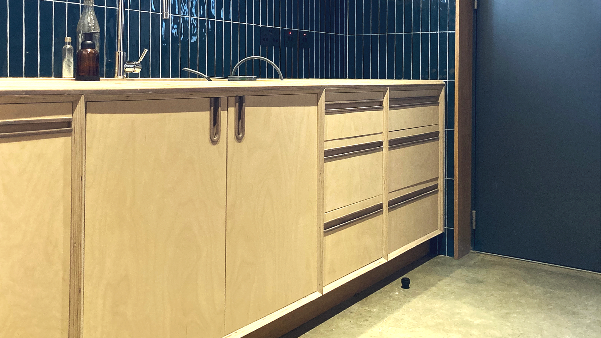 These utility room cabinets are built from birch plywood, chosen for its strength, stability, and clean, consistent grain. The cabinet boxes are cut with 45-degree bevelled edges, revealing the layered lamination of the plywood and turning a functional detail into a defining visual feature.